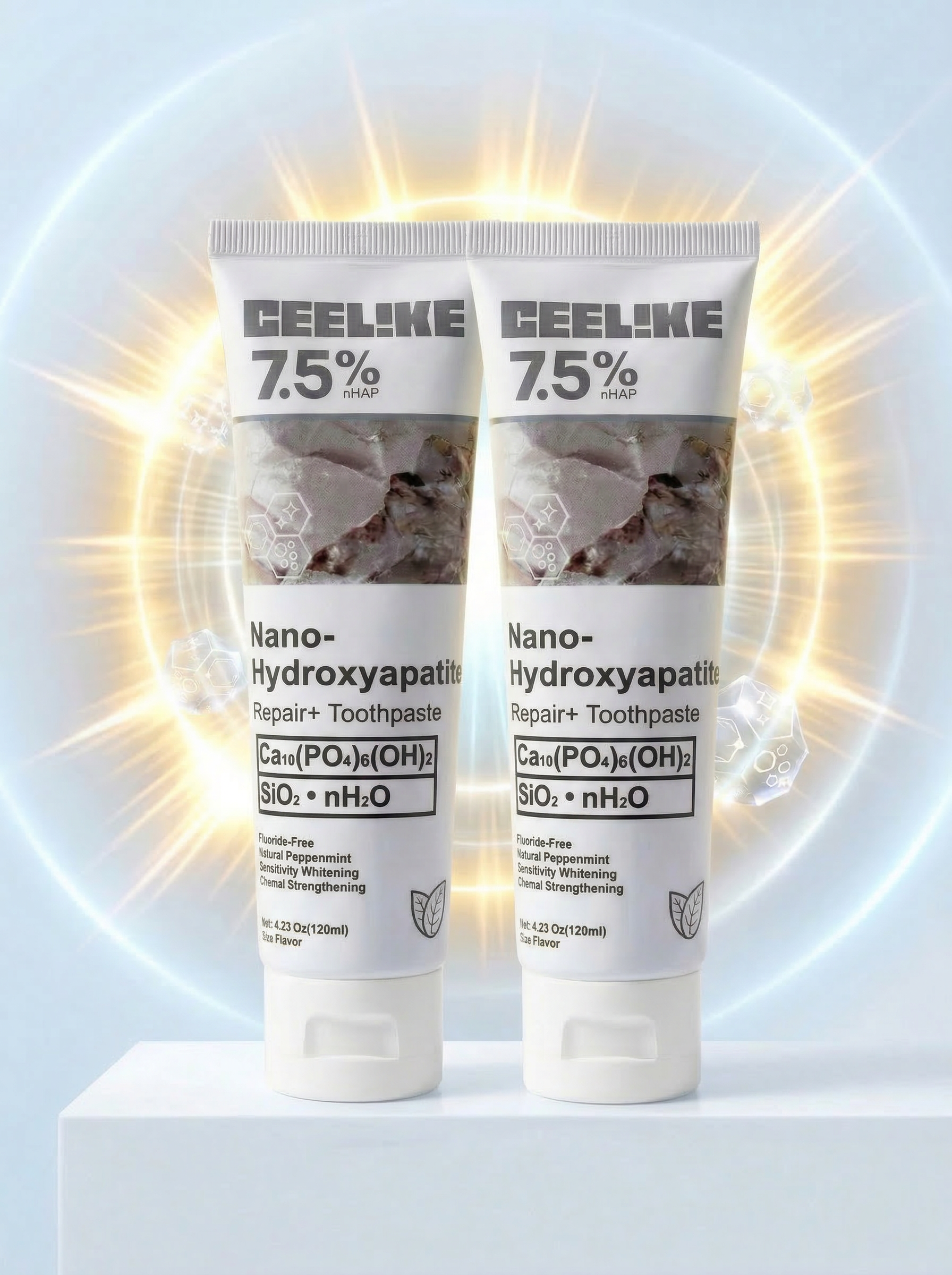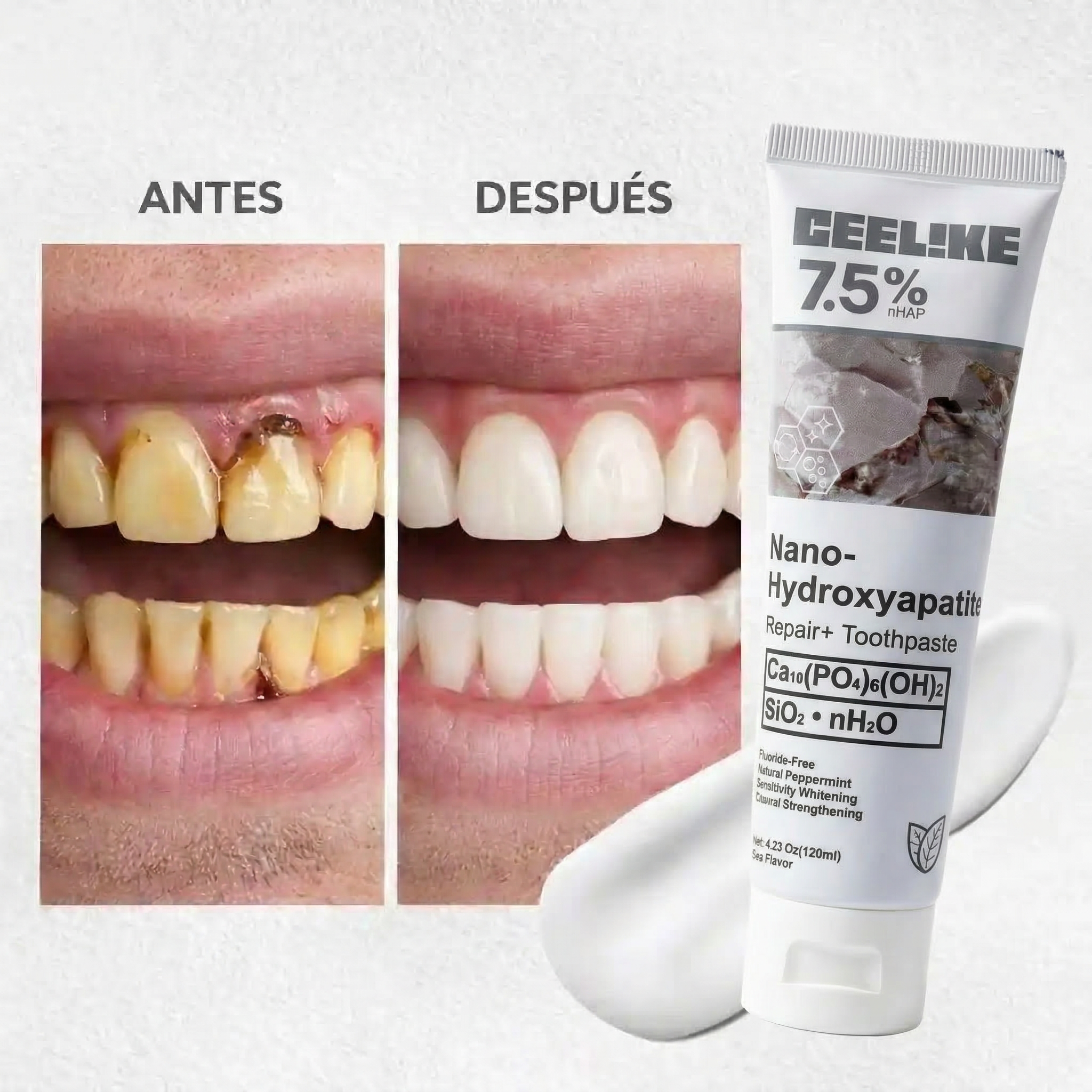 La única pasta dental con 7.5% nHAp que remineraliza tus dientes, devuelve el blanco natural y elimina el dolor al frío o calor.
