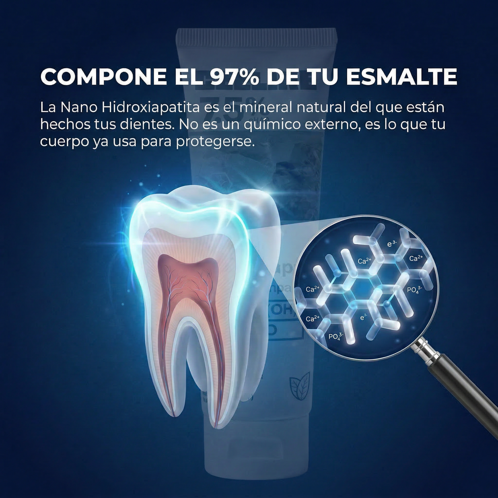 Tus dientes están compuestos en un 97% de Hidroxiapatita. Nuestra fórmula con 7.5% nHAp actúa como un "cemento biológico" que se fusiona con tu esmalte, reconstruyendo cada diente desde adentro hacia afuera.